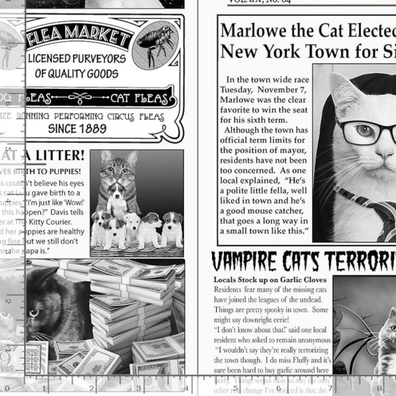 Add some playful charm to your projects with Timeless Treasures Cat Newspaper fabric! This fun design features a quirky black and white faux newspaper layout, filled with a delightful mix of cats and humorous, novelty headlines. Whether you’re creating a cosy quilt, sewing a stylish garment, or adding a whimsical touch to your home textiles, this fabric brings personality and fun to any craft.
