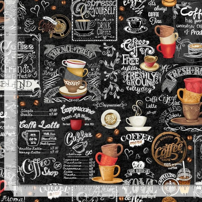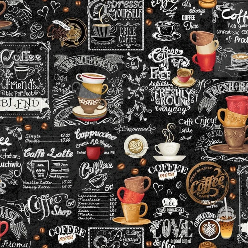 Bring the warmth of your favourite café to your next project with Timeless Treasures Coffee Chalkboard fabric! This stylish design features a black chalkboard café menu, adorned with illustrations of coffee cups, mugs, and playful coffee-related words, creating a delightful, coffeehouse-inspired atmosphere. Perfect for adding a rustic, cosy feel to any sewing or crafting project.