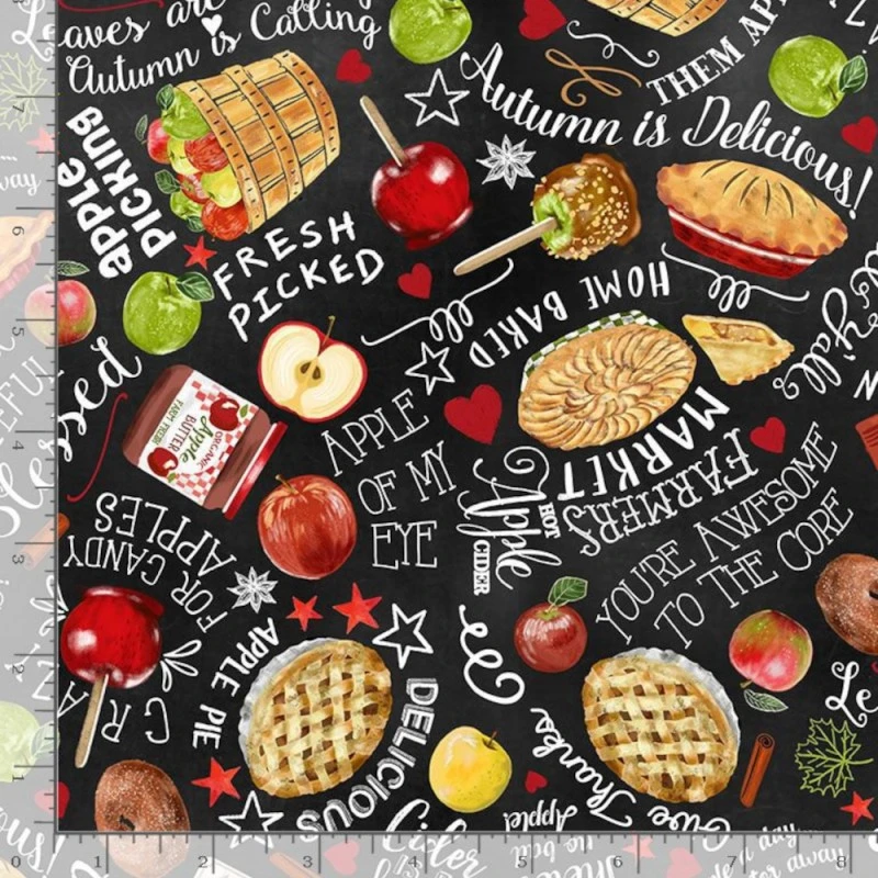 Set against a deep black background, the rich colours of this design stand out beautifully, making it a fantastic choice for seasonal projects. Made from 100% cotton, this material is a quilting weight cotton, perfect for patchwork quilts, dressmaking, home textiles, and general craft use. At 112cm wide and 150GSM, it’s a durable, soft, and easy-to-work-with fabric—ideal for adding an autumnal touch to your handmade creations. Whether you’re crafting kitchen accessories, cosy home décor, or a charming fall-inspired quilt, this fabric is as sweet as apple pie!Â