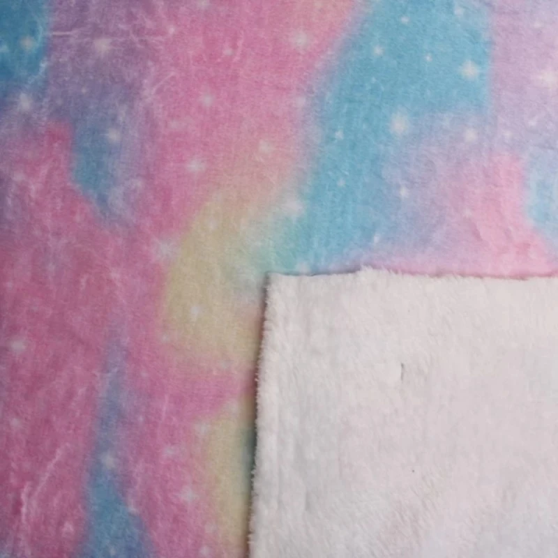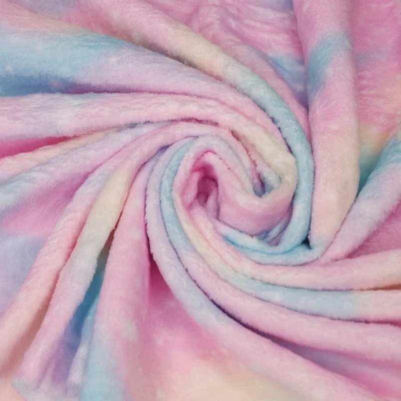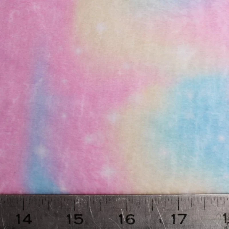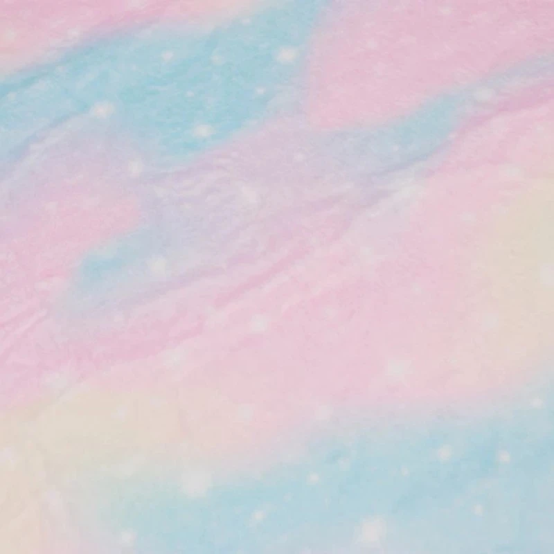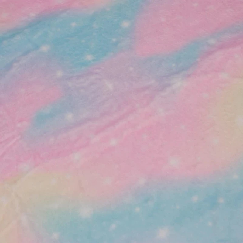 Featuring a pastel, space, sky themed design of pastel, atmospheric clouds and twinkling stars, in blues, pinks and yellows. Fleece is a synthetic insulating fabric made from a type of polyester. It is very comfortable due to its light weight and anti-perspiration qualities, and allows moisture to evaporate, while blocking humidity from the outside.