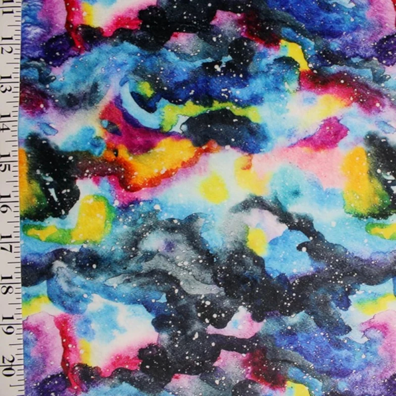 This colourful watercolour galaxy is a wash of electric blues, pinks, yellows and blacks set behind sprinkles of stars and planets that all make up a stunning space scene. The vibrant colours and spectacular scenery illustrate interstellar wonders and intergalactic dreams. This warm fleece would work perfectly for interiors, fashion and craft and much, much more