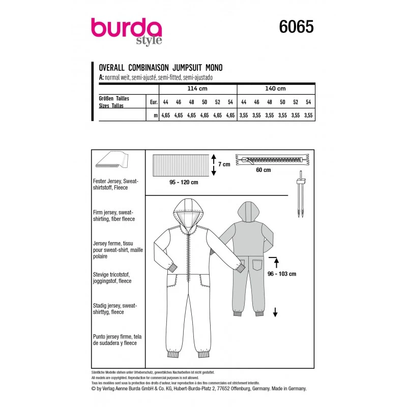 Man’s loose-fitting jumpsuit or onesie with side pockets, front zip fastening and hood. Designed for stretch knits. Easy to sew.