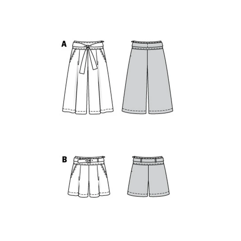 The wide waistband is accented with a tie band or buckled belt made of fabric.