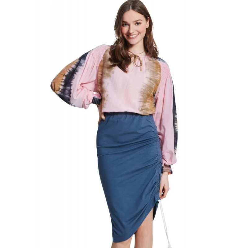Pull-on slim skirts with elasticated waists, in three lengths. Slotted ties at side are ruched to create an asymmetric hem. Designed for two way stretch knits only. Sew Rating: Very Easy.