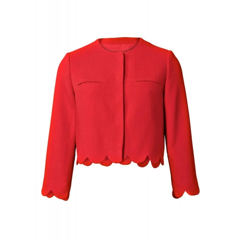 Collarless jackets. Cropped length jacket view A features in-seam pockets and scalloped hem. View B longer length. Wide cuffs and decorative top-stitching. Pair with the matching skirt (pattern 5868) for a two-piece outfit. Sew Rating: Average.