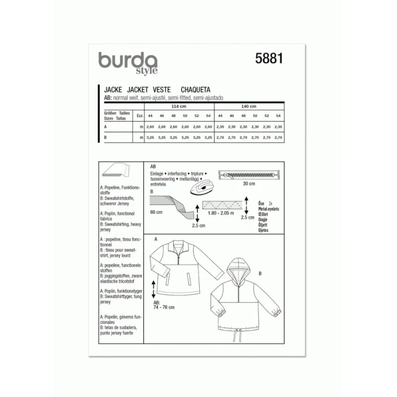 Casual slip on jacket tops. Zipped neckline and hood option. Sew Rating: Average.