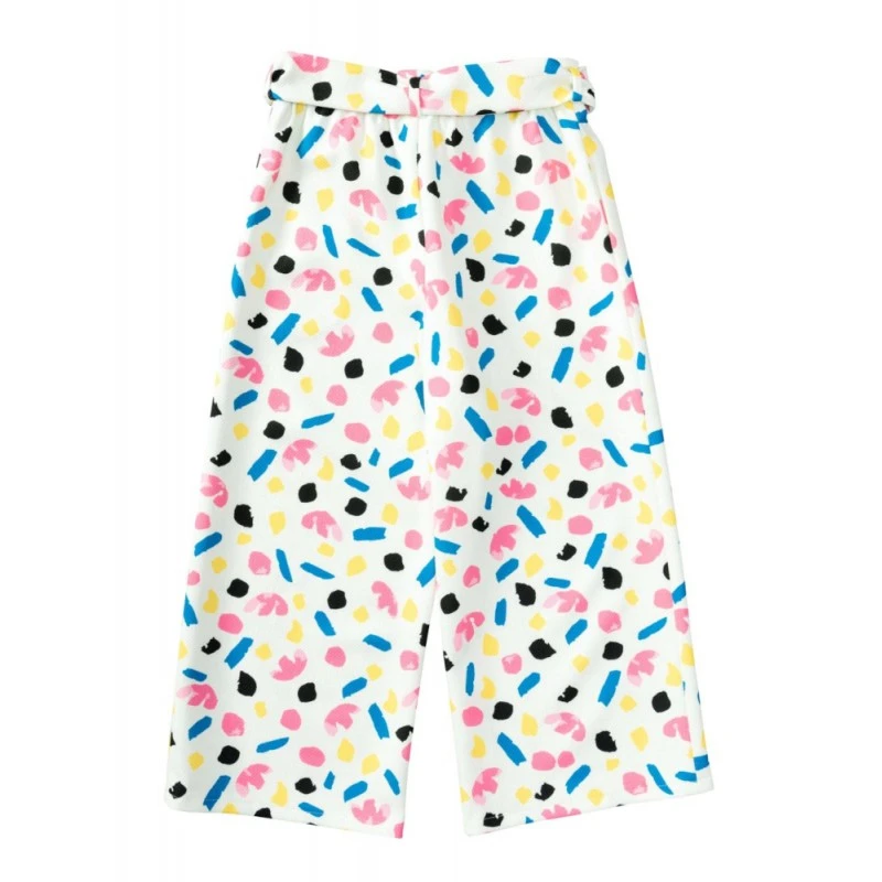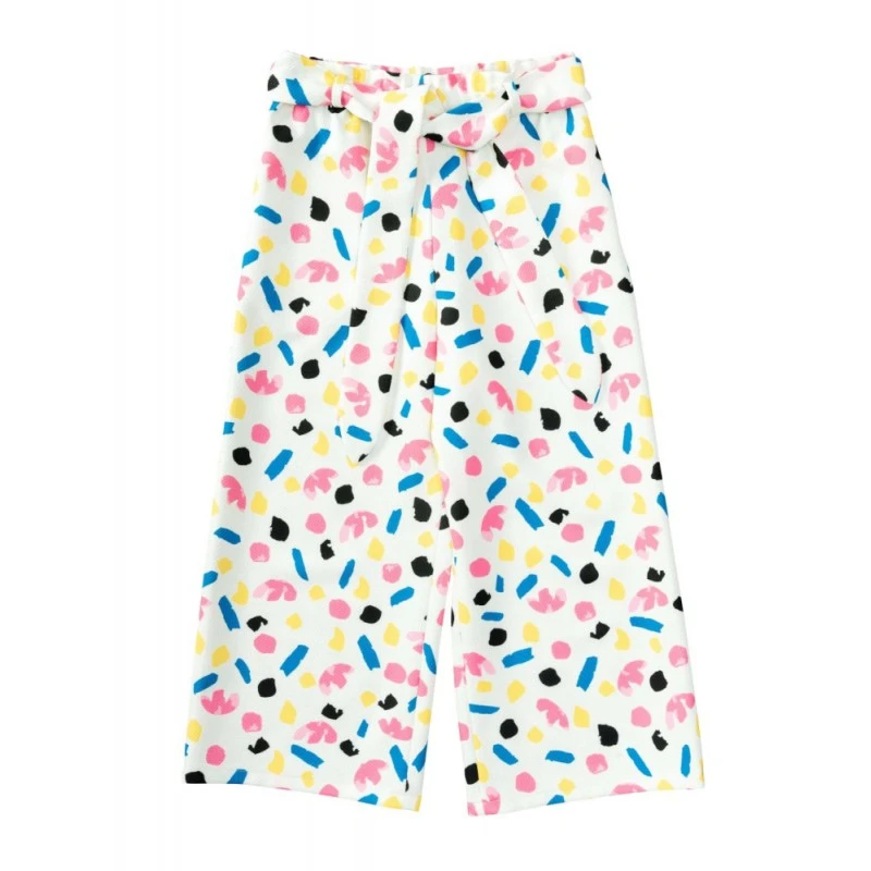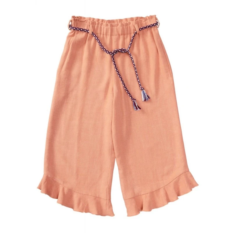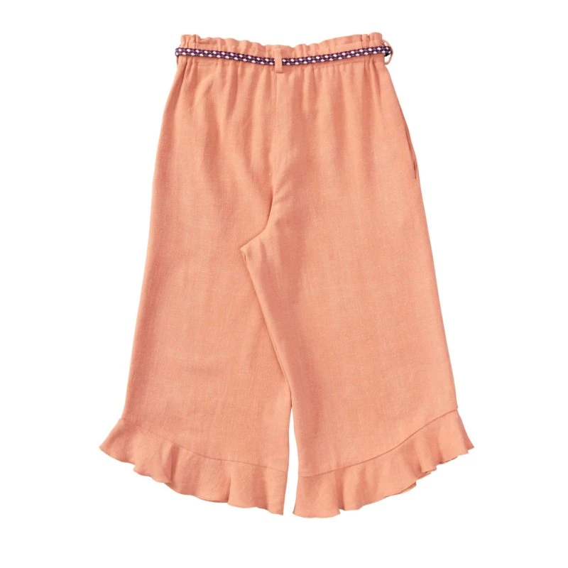 Pants are pull-on with elasticated waist, full-length wide leg, cropped leg with frill trim. Narrow tie belt. Designed for woven fabrics.