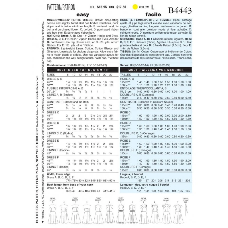Dress: With close fitting bodice and slightly flared skirt has bodice variations, back zipper and is below mid-knee length. B: Has contrast band and variations, back zipper and is below mid-knee length. B: Has contrast band, tie belt and purchased flower. C: Has tie belt. D: Has purchased ribbon and bow trim. E: Has purchased ribbon bow.