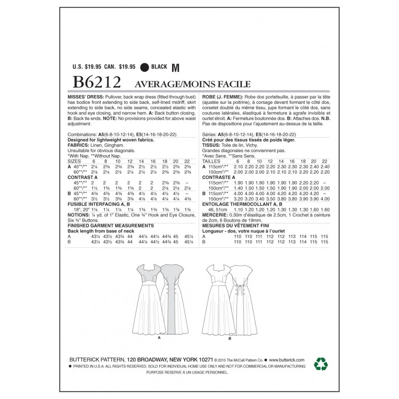 Pullover, back wrap dress (fitted through bust) has bodice front extending to side back, self-lined midriff, skirt extending to side back, no side seams, concealed elastic with hook & eye closure, and narrow hem. A: back button closing. B: back tie ends. Note: no provisions provided for above waist adjustment. Retro 1952