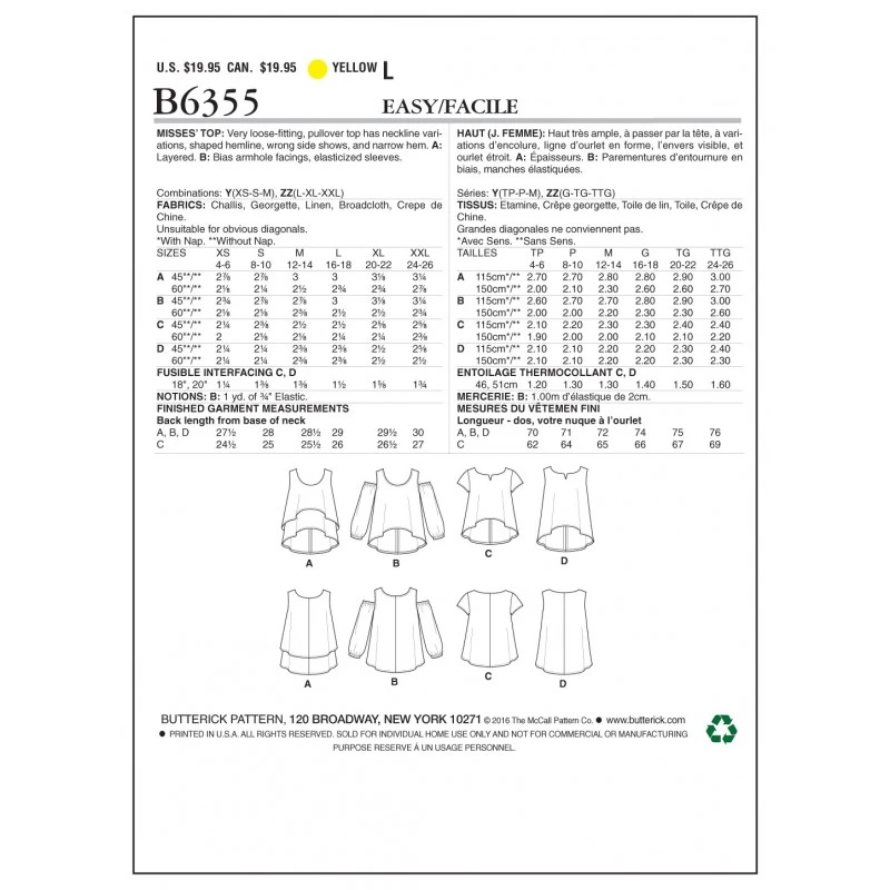 Very loose-fitting, pullover top has neckline variations, shaped hemline (wrong side shows) and narrow hem. A: Layered. A, B:Scoop neckline. A, D: Sleeveless. B: Bias armhole facings and elasticized, off-the-shoulder long sleeves. C: Short sleeves. C, D: Notched neckline.