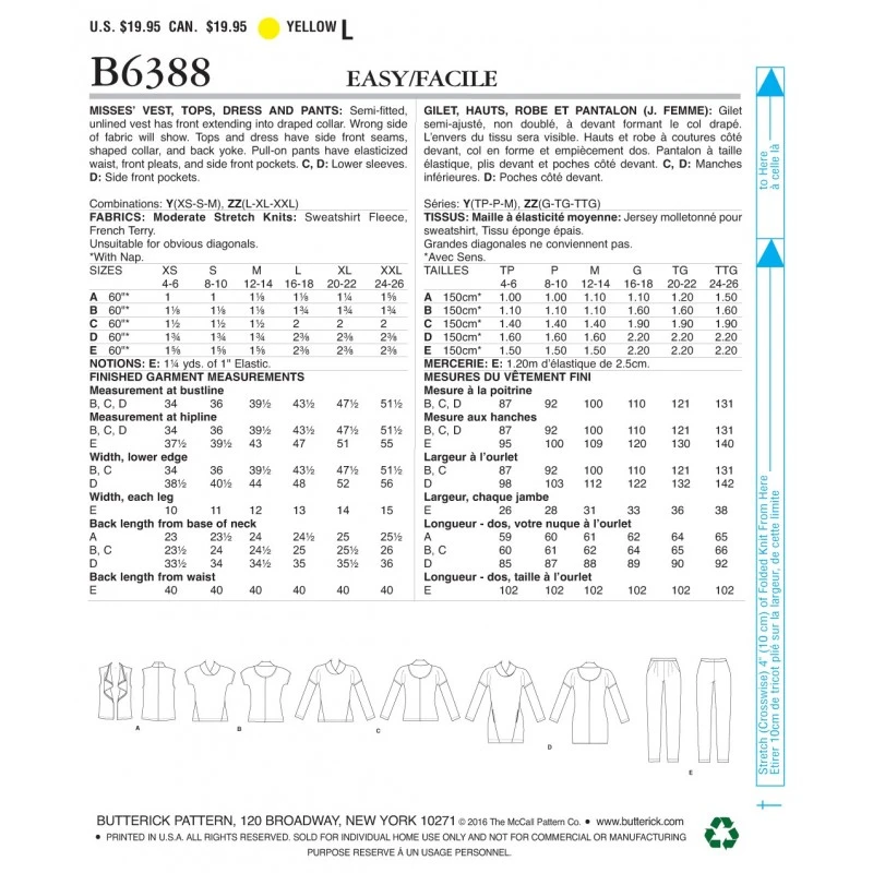 Semi-fitted, unlined vest has front extending into draped collar. Wrong side of fabric will show. Tops and dress have side-front seams, lapped collar, and back yoke. Pull-on pants have elasticized waist, front pleats, and side-front pockets. C, D: Lower sleeves. D: Side-front pockets.