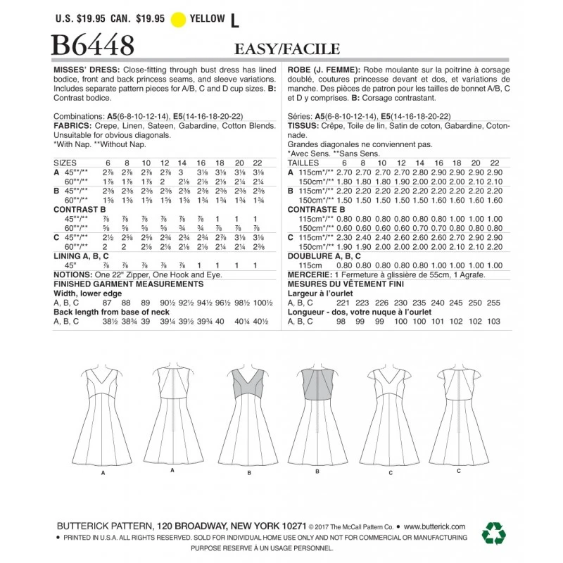 Close-fitting through bust dress has lined bodice, front/back princess seams, and sleeve variations. B: Contrast bodice.