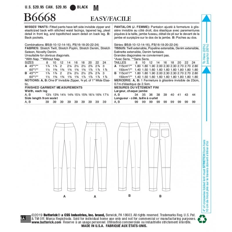 Fitted pants have left side invisible zipper and elasticized back with stitched waist facings, tapered leg, pleat detail in front leg and topstitched seam detail on back leg. B: Back pockets..