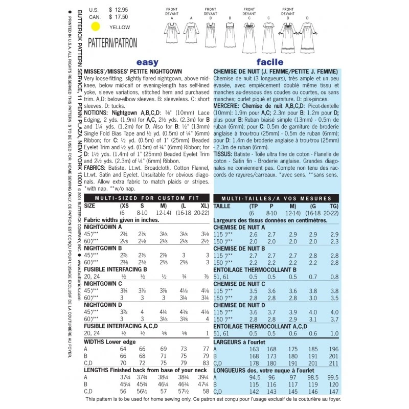 Very loose-fitting, slightly flared nightgown, above mid-knee, below mid-calf or evening-length has self-lined yoke, sleeve variations, stitched hem and purchased trim. A,D: below-elbow sleeves. B: sleeveless. C: short sleeves. D: tucks.