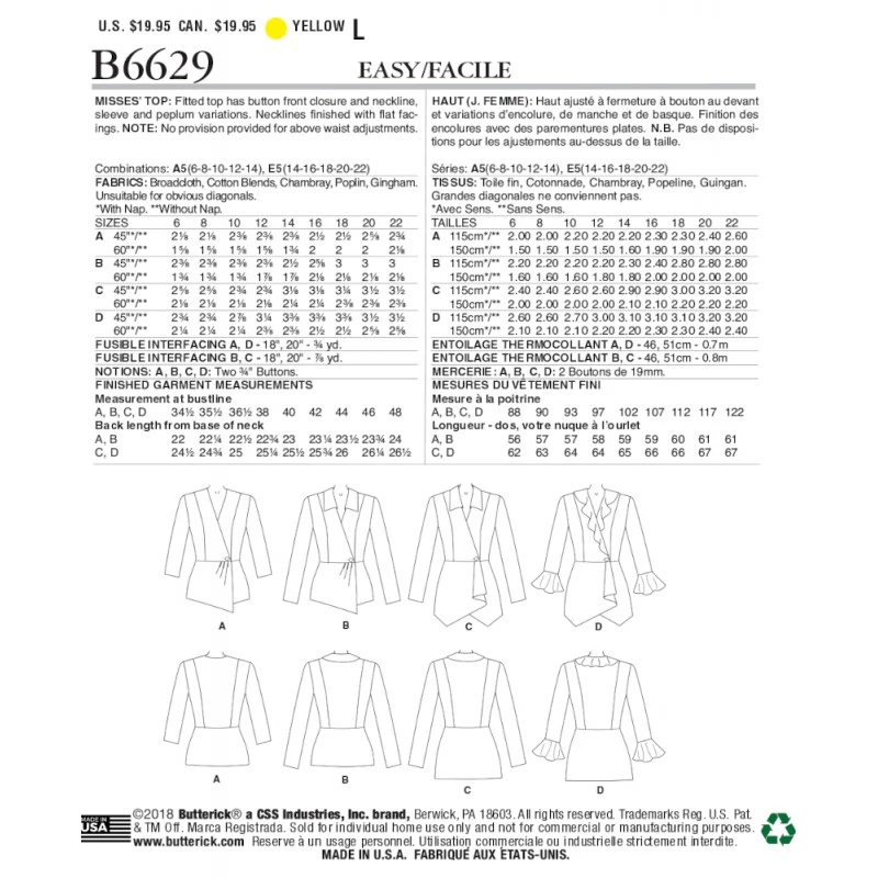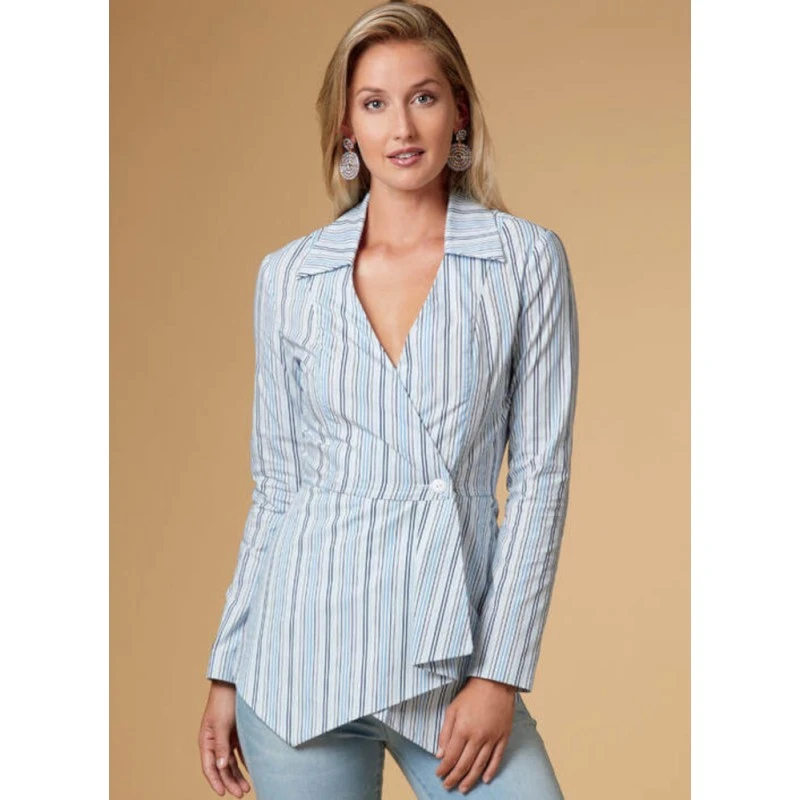 Misses’ Fitted Top with Front Button Closure Fitted top has button front closure and neckline, sleeve and peplum variations. Necklines finished with flat facings. No provision provided for above waist adjustments.