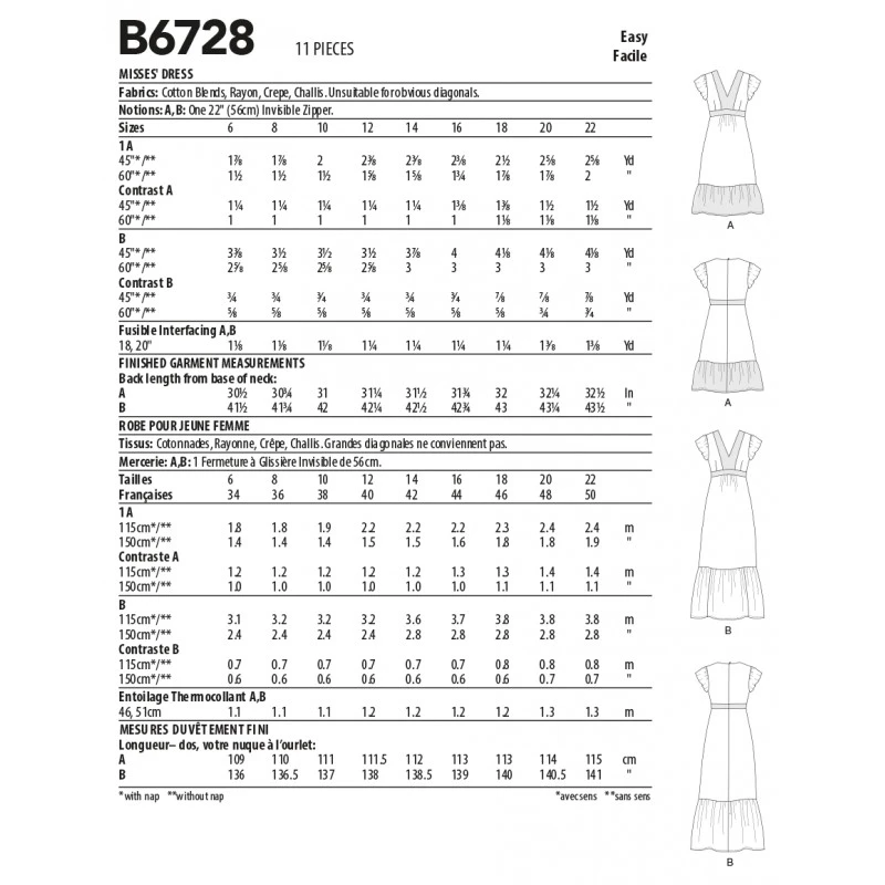 Misses’ V-neck, empire-waist dress, flutter sleeves, contrast neck, waist bands and length variations. A: contrast hem ruffle.