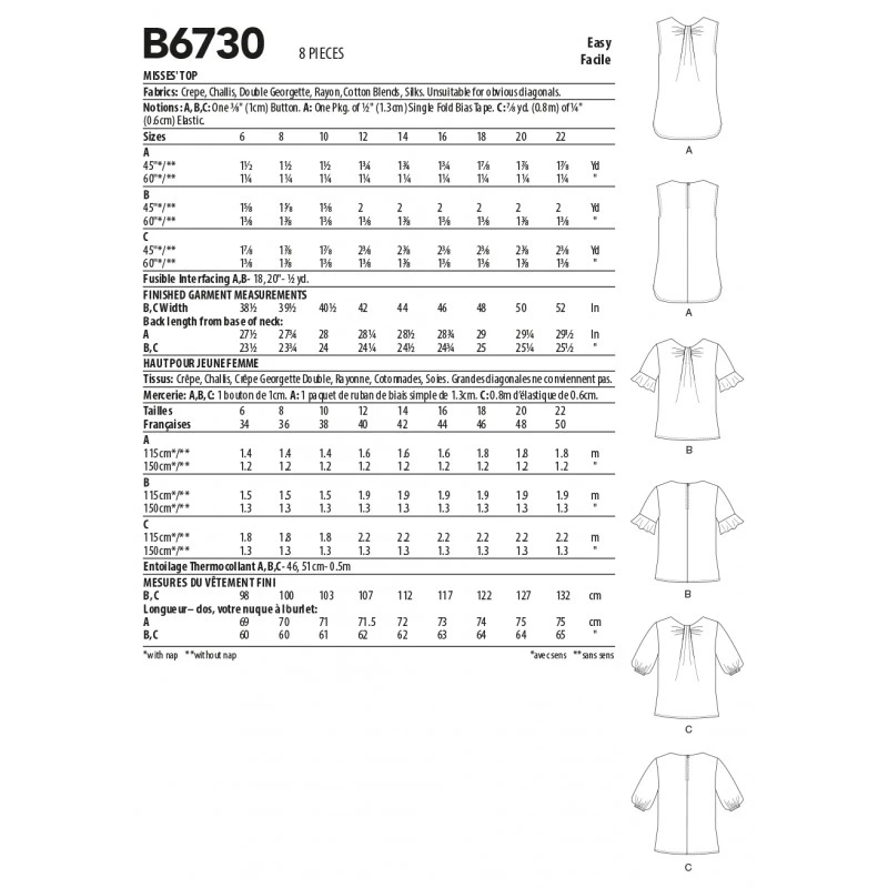 Butterick Sewing Pattern B6730 Misses’ Tops with Front Neckline Tucks