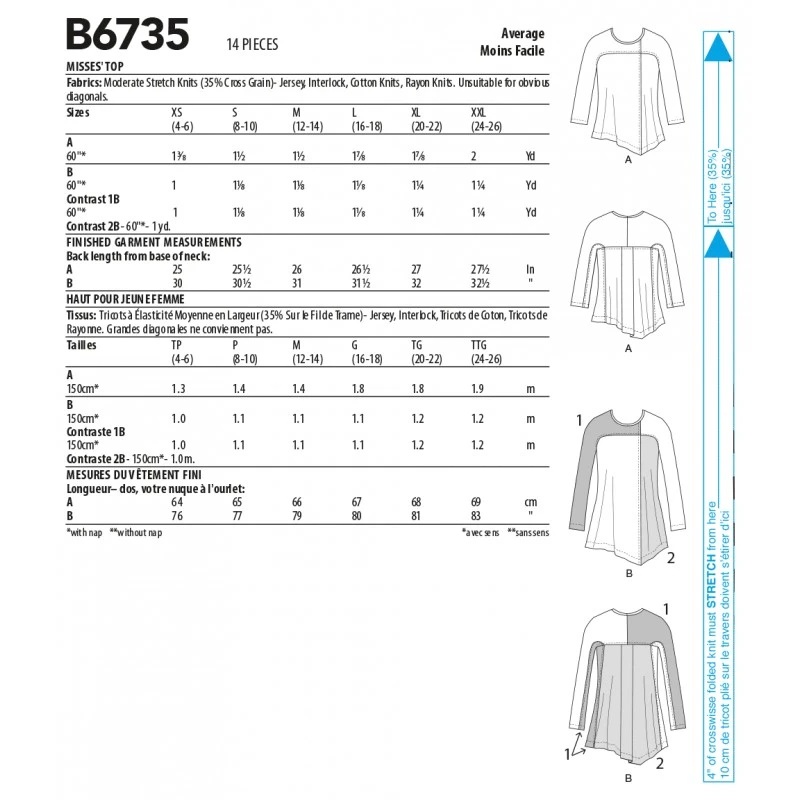 Misses’ top in two lengths, with seam detail variations. A: 3/4 sleeves. B: two contrast fabrics and long sleeves.