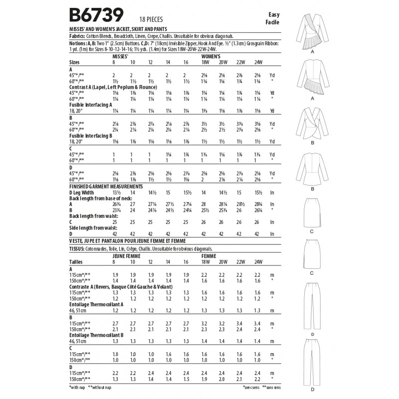 Butterick Sewing Pattern B6738 Misses’ Wrap Jacket Peplum Top Skirt and Trousers
