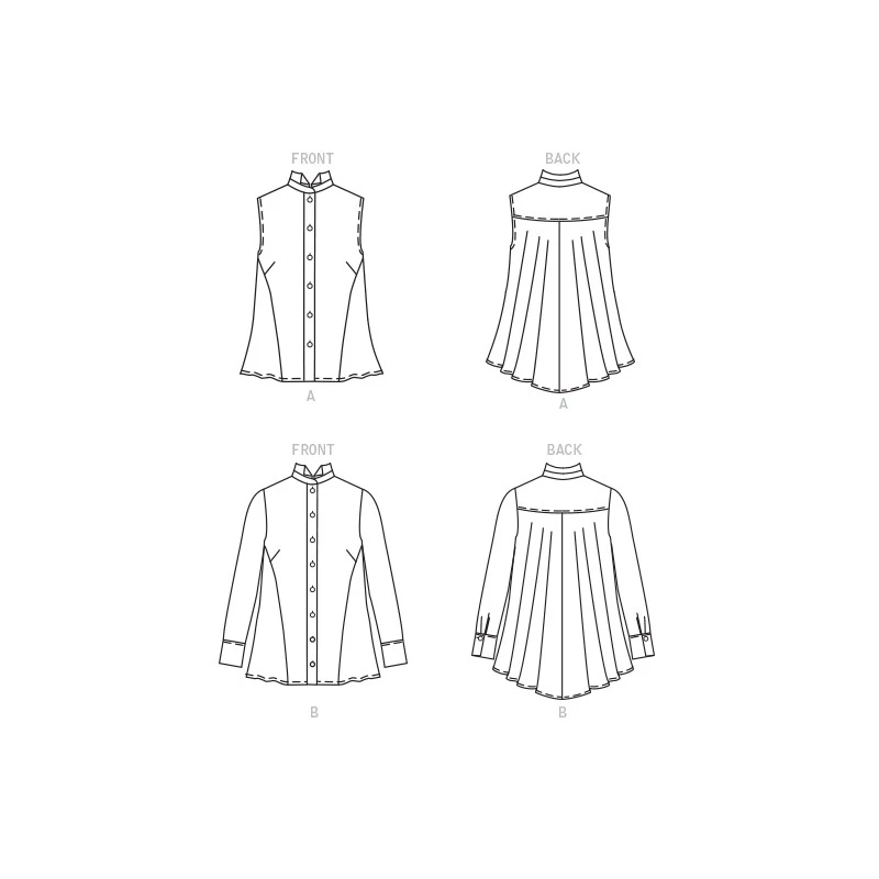 Sleeveless or long sleeve button front top with full swing back & high neck collar.