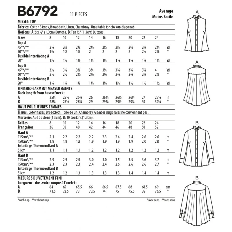 Butterick Sewing Pattern B6792 Misses’Â Swing Blouse Shirt Button Front Loose Fit