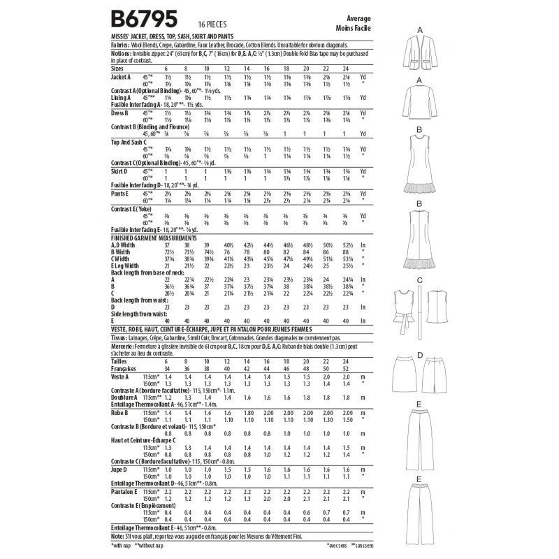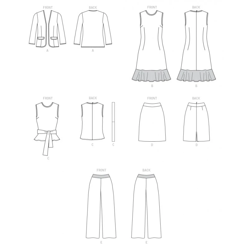 Misses’ open front, lined jacket with bias binding trim; sleeveless dress with flounce hem; top with sash, skirt & trousers.