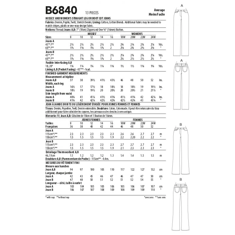 Straight-leg or boot cut, below waist jeans have side-front pockets with inside pocket, front fly zip closure, back yoke, back pockets, waistband with button & buttonhole closure, belt carriers & narrow hem finishing on jean legs. Tips for how-to-fit a flat derriere & eliminate baggy pants are also included. Sewing Skill: Average.