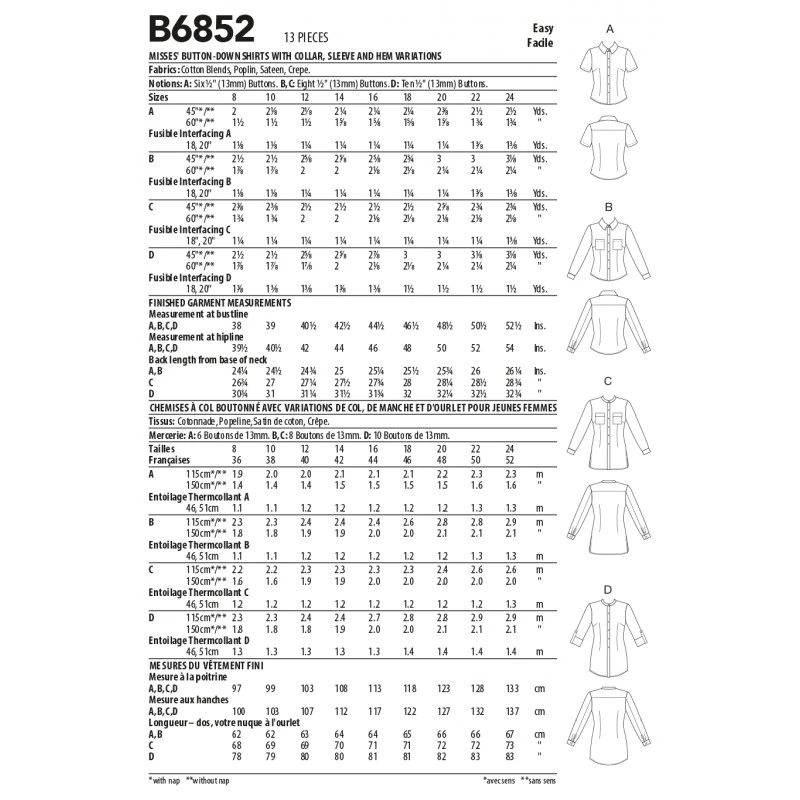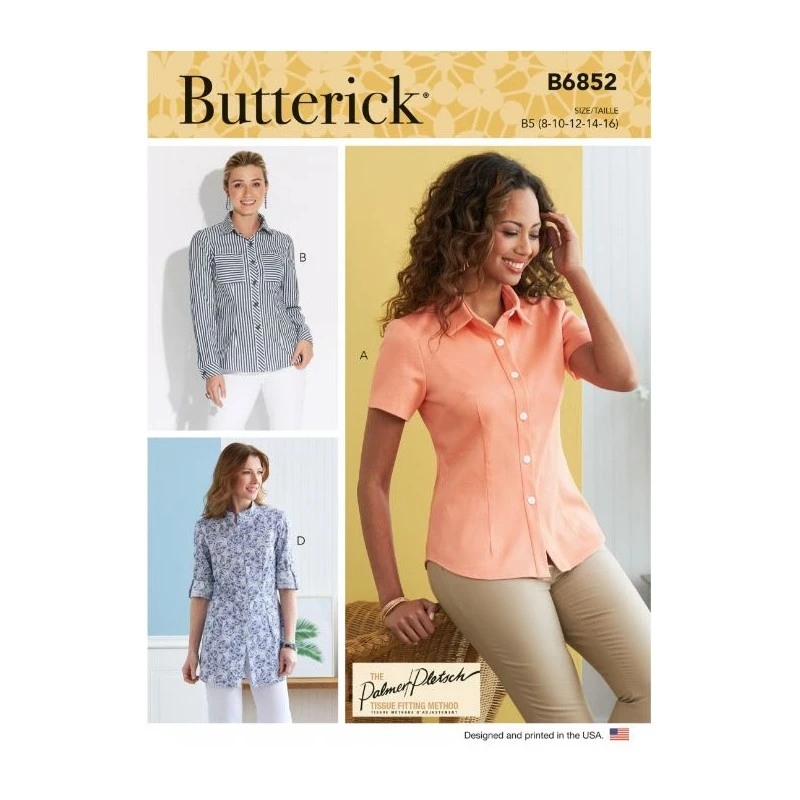Butterick Sewing Pattern B6852 Misses’ Button Down Semi Fitted Shirt Back Yoke