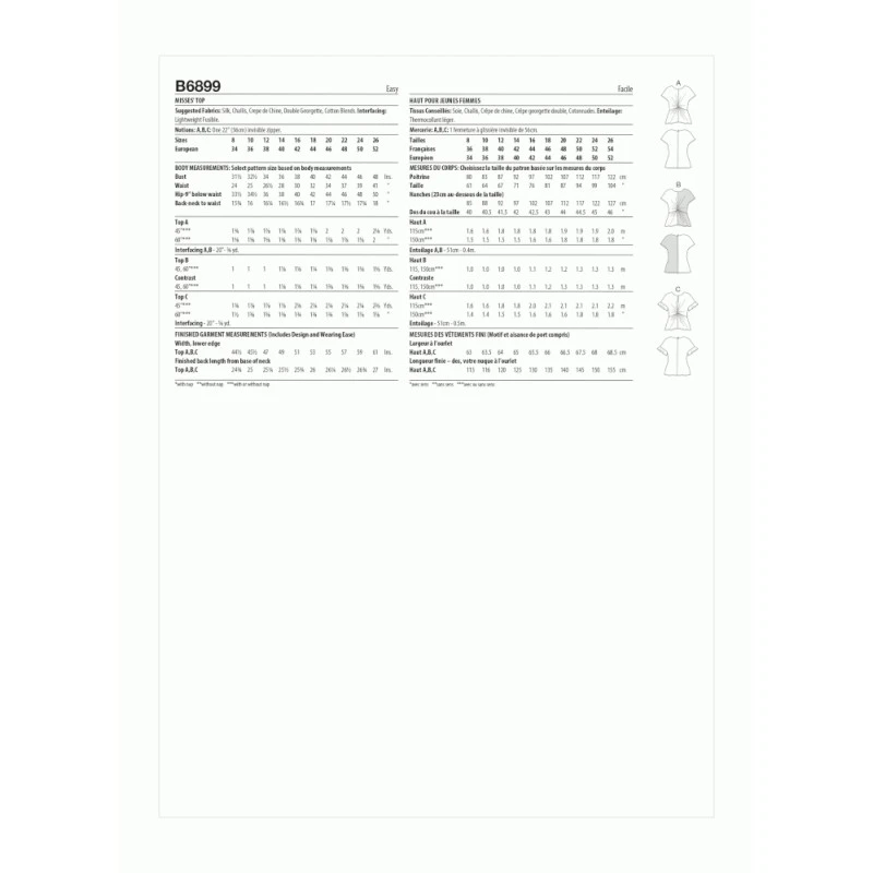 Short sleeve top with twist front and invisible back zipper. View B is colourblocked. View C has ruffle sleeves and open slit neck. Sewing skill: Easy.