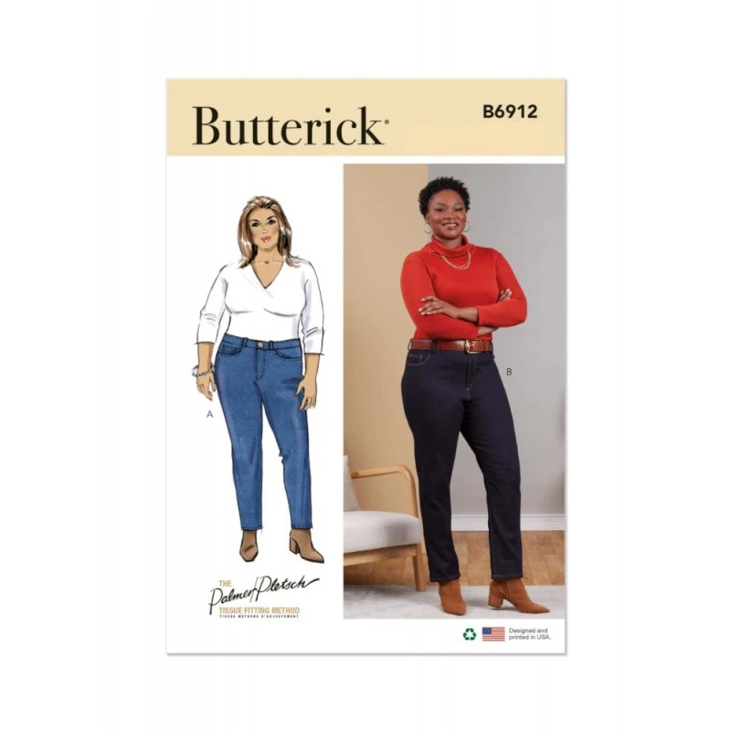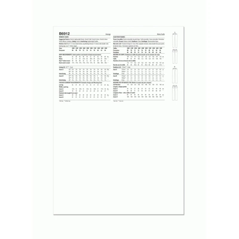 Jeans feature side-front pockets, waistband with button and buttonhole closure, back pockets, belt carriers, and front fly zipper closure. View A: skinny jeans with a moderately dropped waist. View B: high waisted straight leg jeans. Sew Rating: Average. Looking for the alternate size pack? Check out B6911