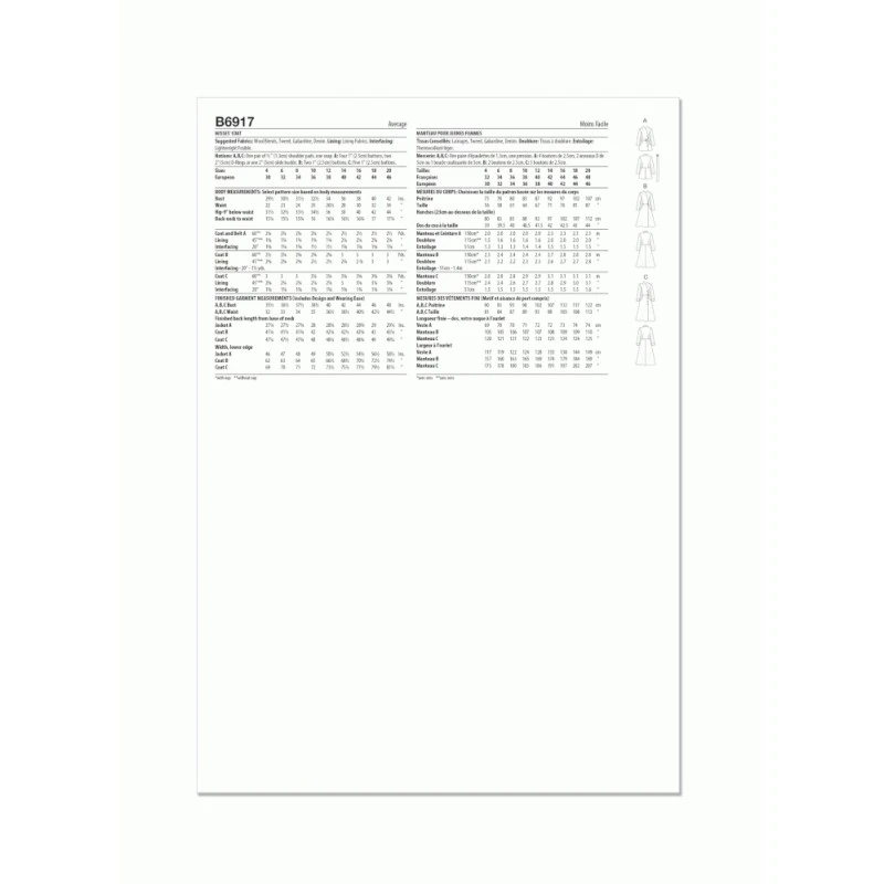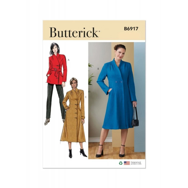Button front wrap coat with length variations has stand collar, pleats at shoulders, side pockets, back darts, and centre back and waist seams. Coat A:belt with purchased buckle or D-rings, belt loops, and side front buttons. Coat B: two-button closure at waist. Coat C: side front buttons and turnback cuffs. Sew Rating Average.