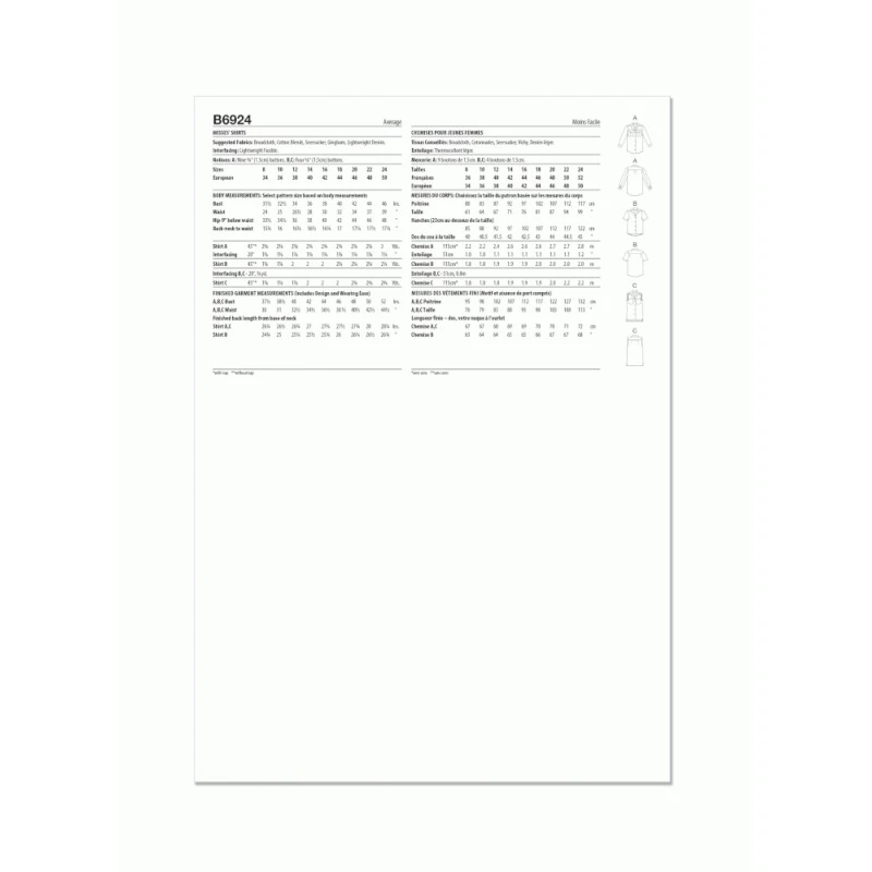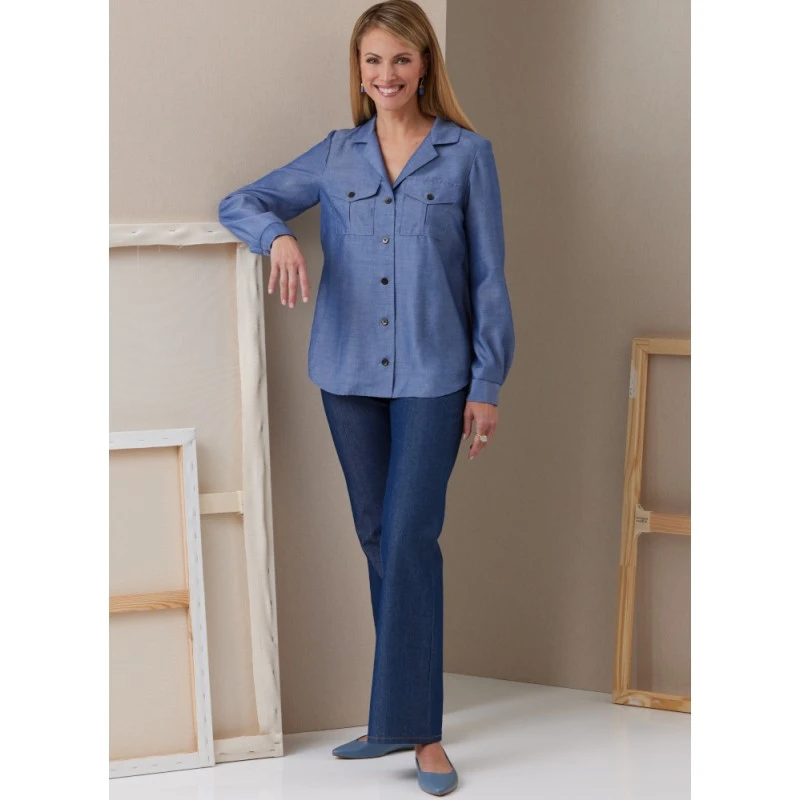 Fitted shirts with collar, yoke, back pleats, stitched hem and sleeve variations. View A: long sleeve shirt with flap pockets and back inverted pleat. View B: short sleeve shirt with longer back. View C: sleeveless shirt with patch pockets, side slits and longer back. Designed for woven fabrics. Sew Rating: Average.