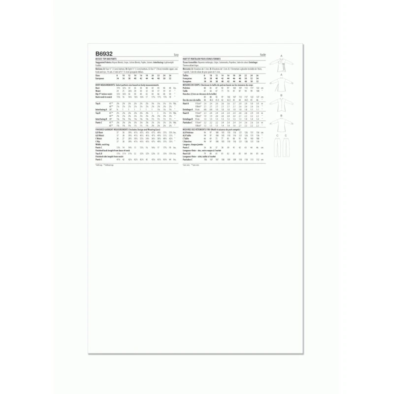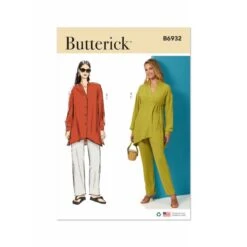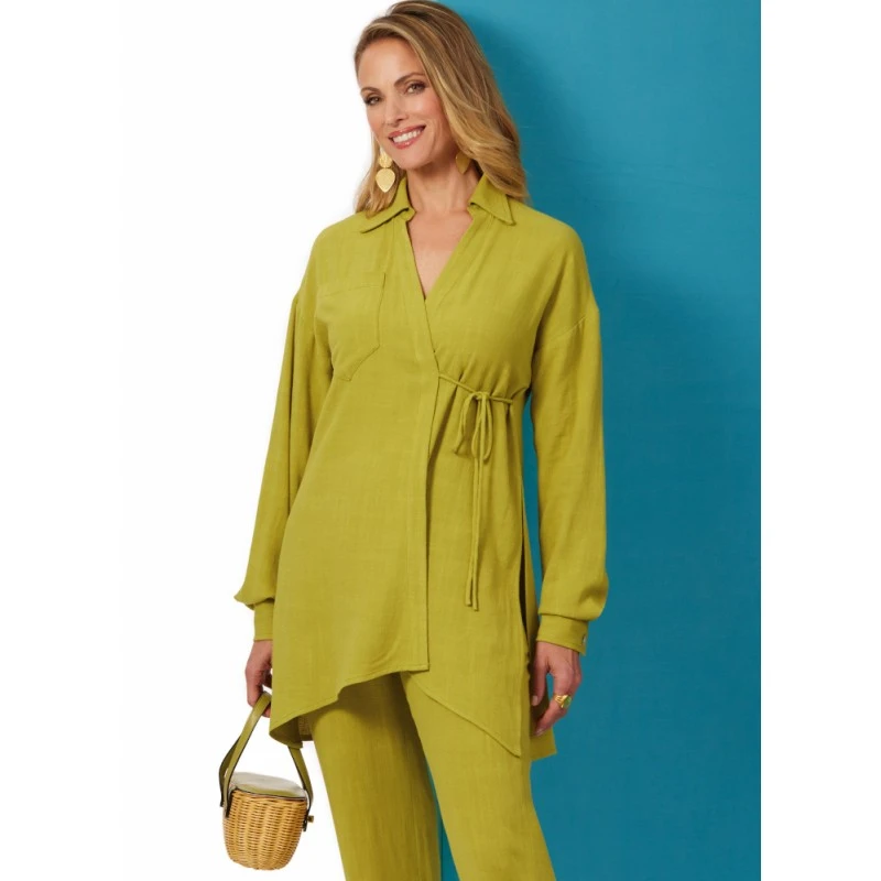 Loose-fitting tops with dropped shoulders, side slits, long sleeves with button cuffs, and pleat opening. View A: Collar, collar band, patch pocket, front ties. View B: Front button closure. Trousers have darted waist and zipper closure. Designed for woven fabrics. Sew Rating: Easy.
