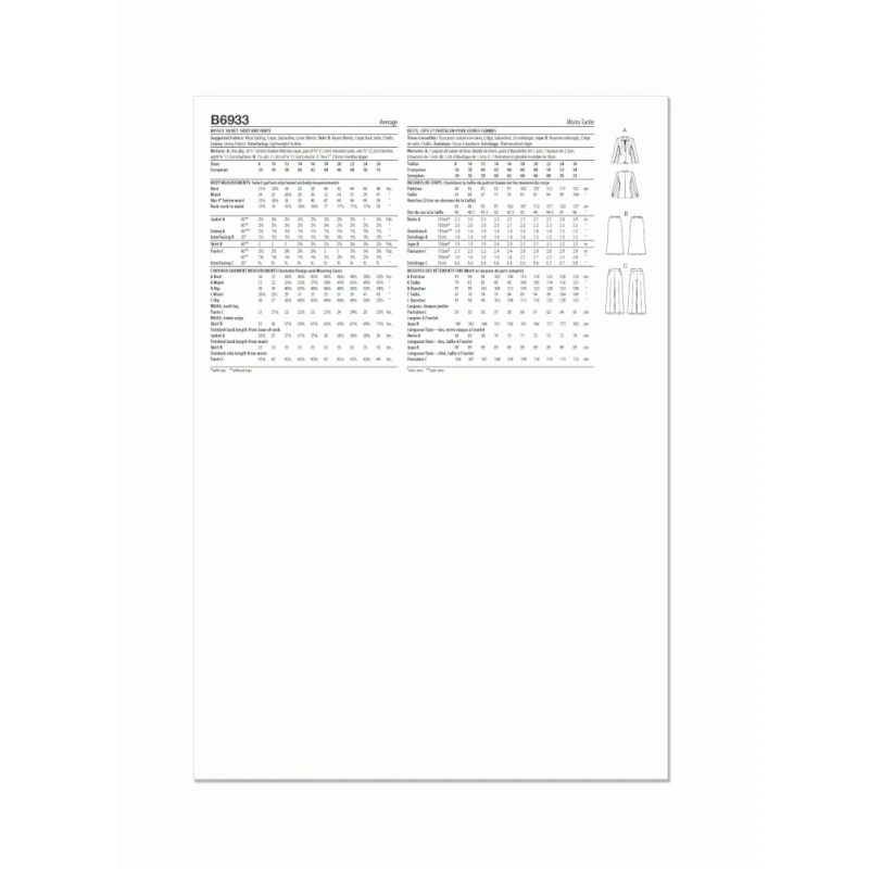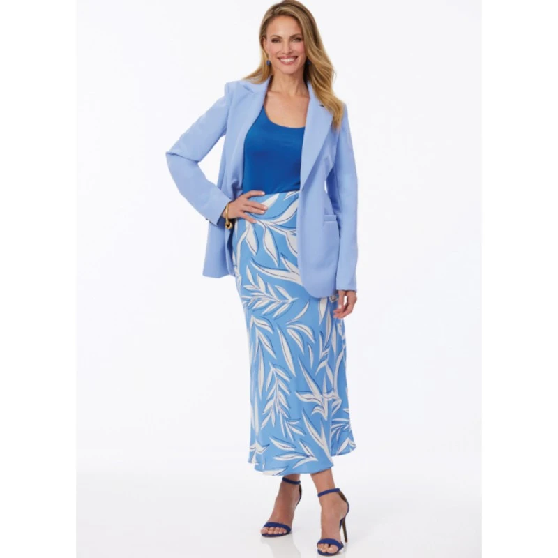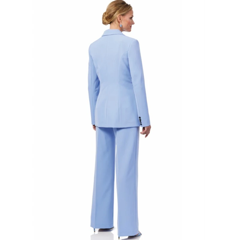 Semi-fitted, partially lined jacket with notch collar, shoulder pads, princess seams, welt pockets and long two-piece sleeves with button trim. Bias A-line skirt has elasticated waist and narrow hem. Full length trousers have side front pockets and side seam zipper. Designed for woven fabrics. Sew Rating: Average