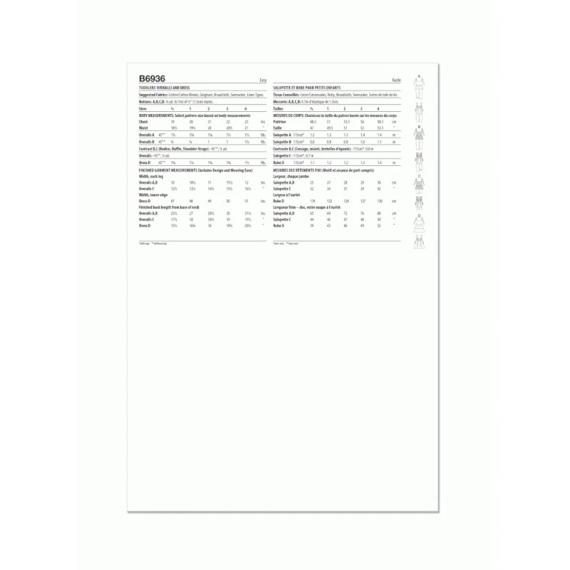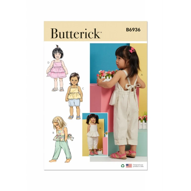 Toddlers’ overalls and dress feature a ruffled waist and open back with back ties. Back waist is elasticated. Sew Rating: Easy.