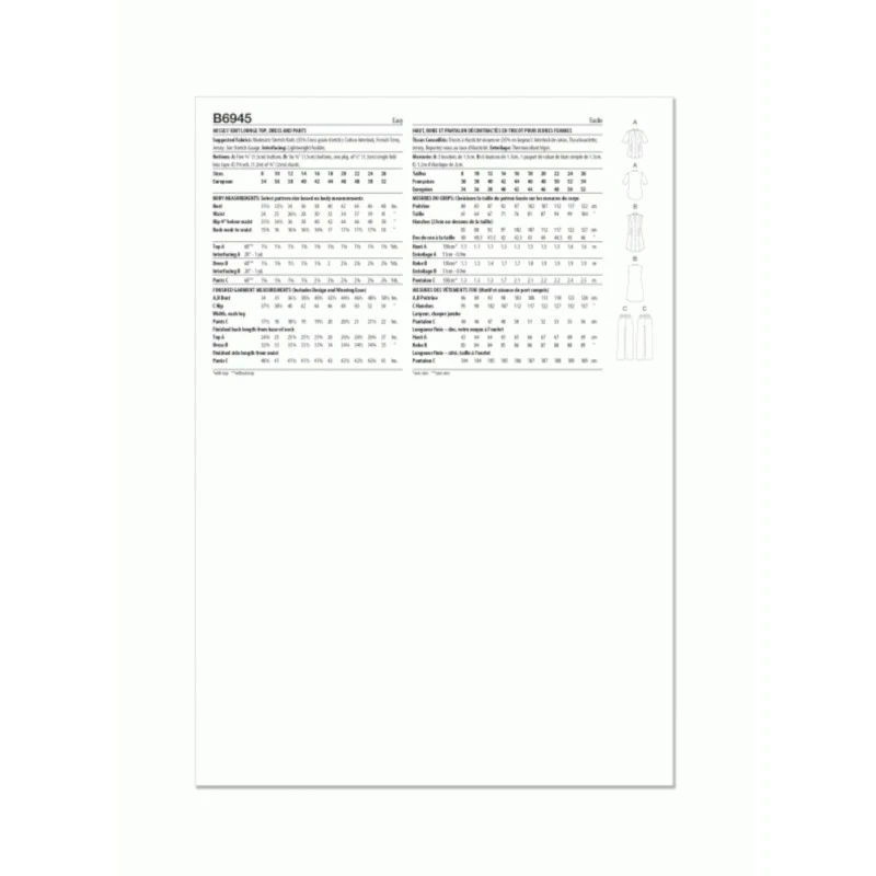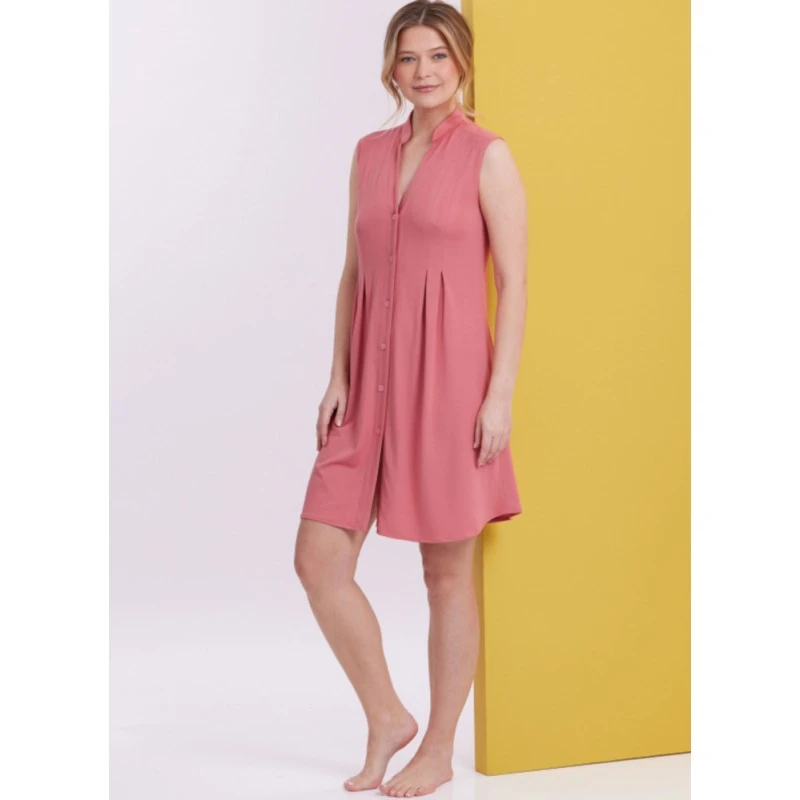 Misses’ Knit Lounge Top, Dress and Trousers Button front top or dress with split neckline, front released pleats, shaped hem and stitched hems. View A: short sleeves. View B: armhole is finished with purchased bias tape. Semi-fitted, straight leg trousers with elasticated waist. Sew Rating: Easy. Sizes