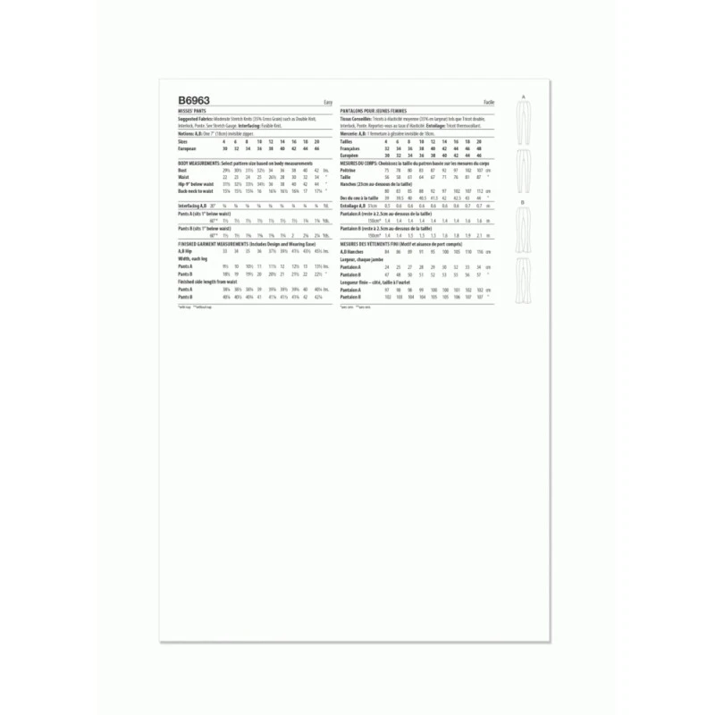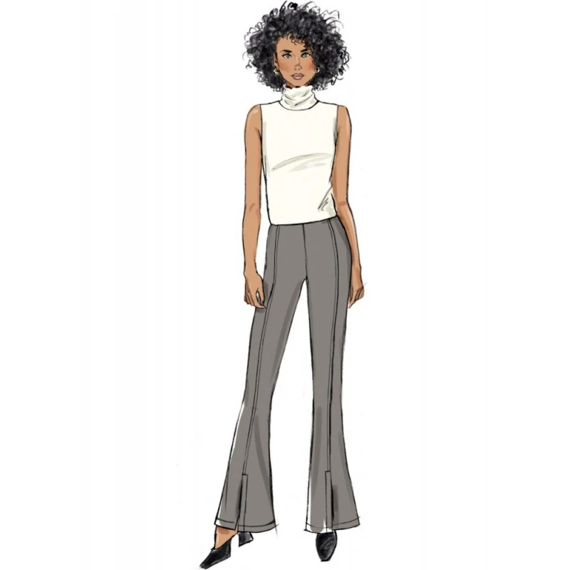 Close-fitting trousers sit 1″ below waist. Princess seams, topstitching, waist facings and stitched hems. View A: tapered fit. View B: bootcut with front vent. Both views have invisible side seam zipper. Designed for moderate stretch knits. Sew Rating: Easy. Looking for the alternate size pack? Check out B6964
