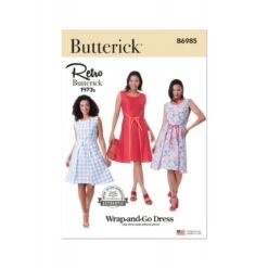 Misses’ Retro Vintage 1970’s Wrap-and-Go Dress Butterick Vintage 1970’s Wrap-and-Go dress. Semi-fitted, sleeveless wrapped dress has scoop neckline and purchased fold over braid finish extending into front ties. Easy – only three main pattern pieces. No buttons, no zippers, no snaps. Just slip it on wrap and tie in front and you are all set to go. Sew Rating: Easy. FABRIC SUGGESTIONS:
