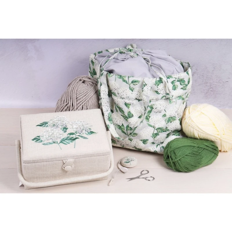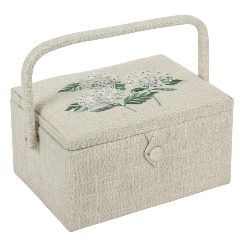 Medium-sized sewing box covered in cotton fabric with embroidered details.