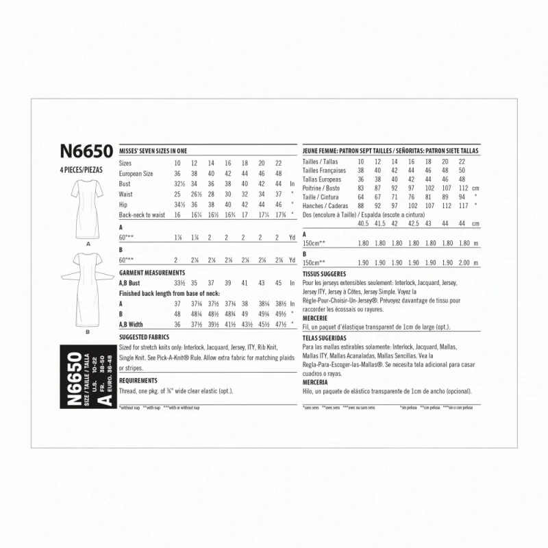 Misses’ Dresses in two lengths, easy to sew and design for stretch knits. slim pull-on dress with optional waist-tie feature. Short sleeves in two length options.