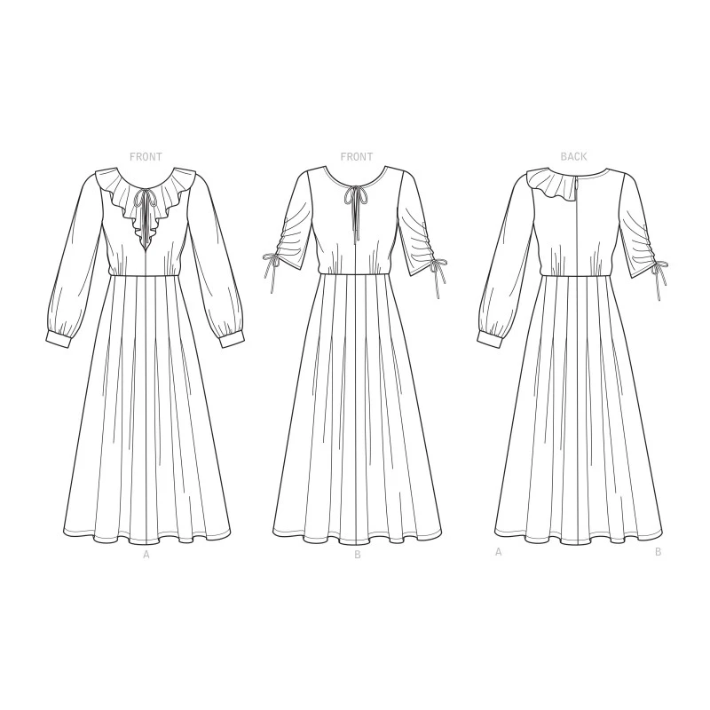 Misses’ dresses with shirred or long sleeves, optional front ruffle, bodice waist gathers and pleated skirt..