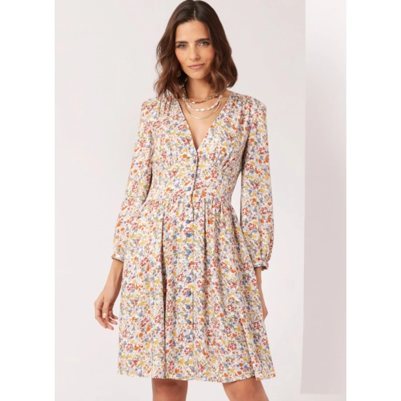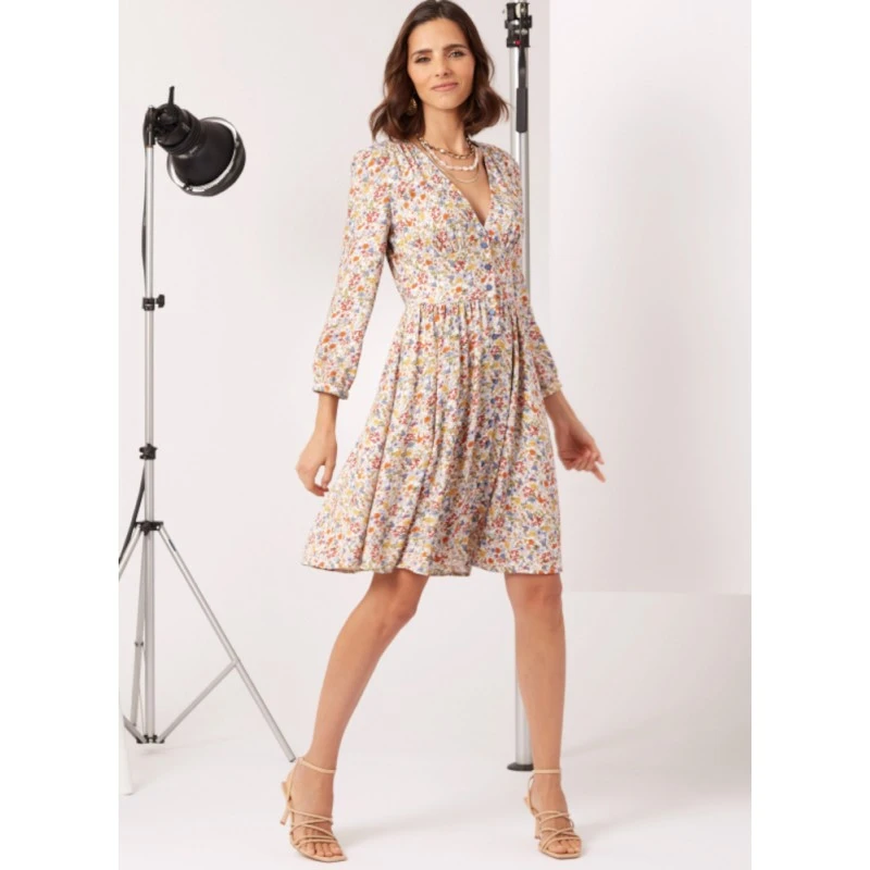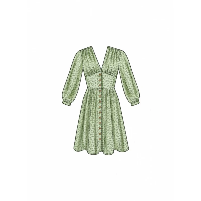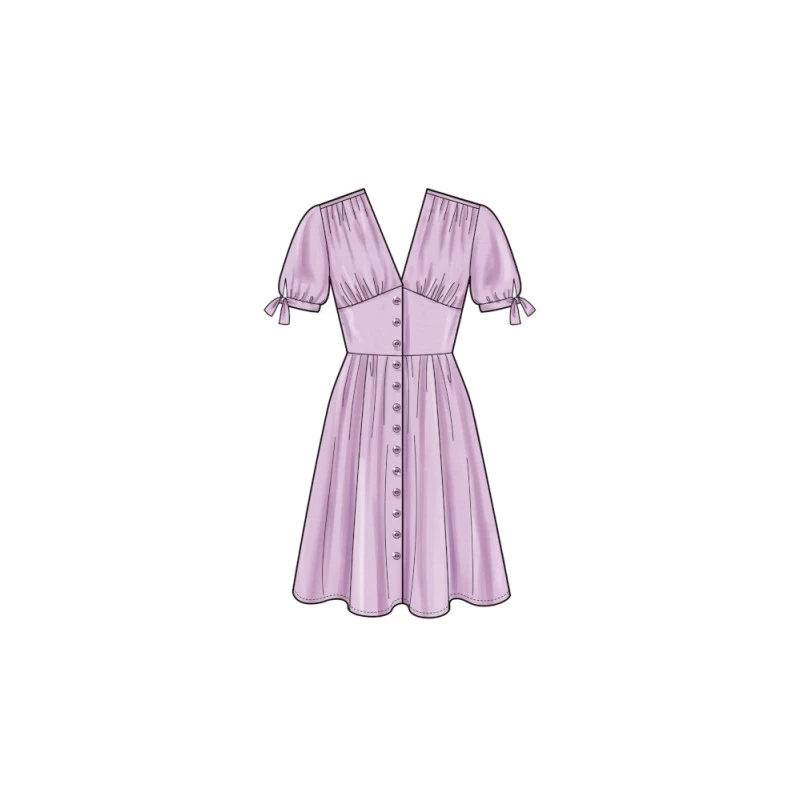 Easy to sew button front dress has short or long sleeves, fitted bodice with front midriff, back yoke and gathered skirt with side seam pockets.