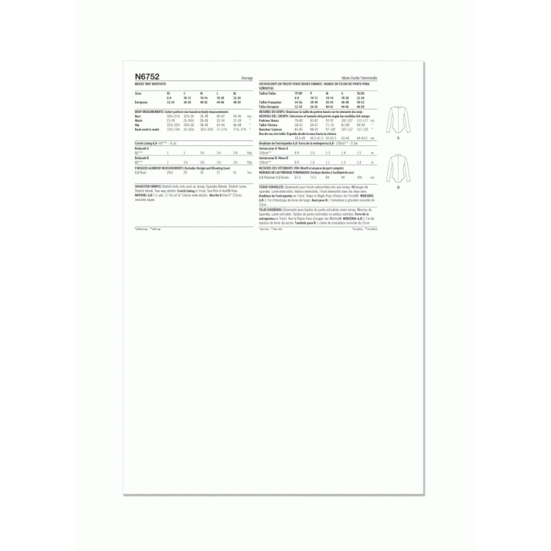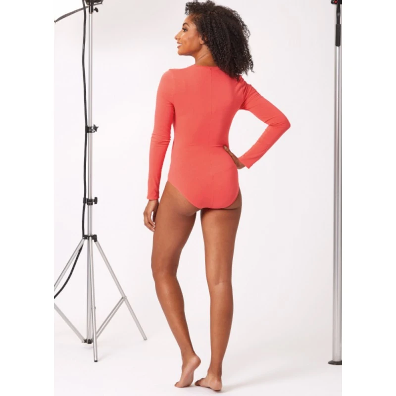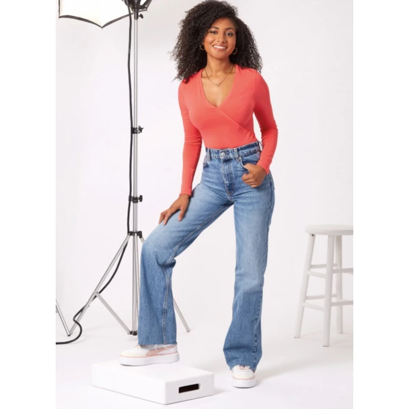 Long sleeve bodysuit, deep V-neck wrap front or mock neck. Sized for stretch knits only. Sew Rating: Average.