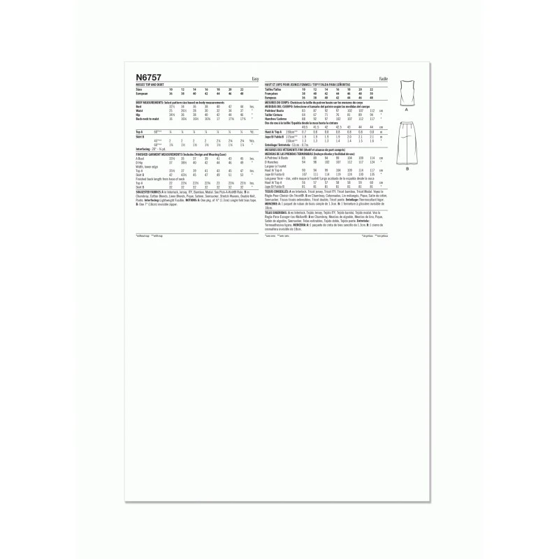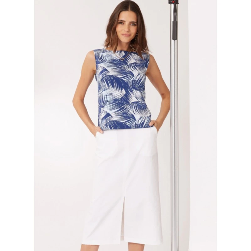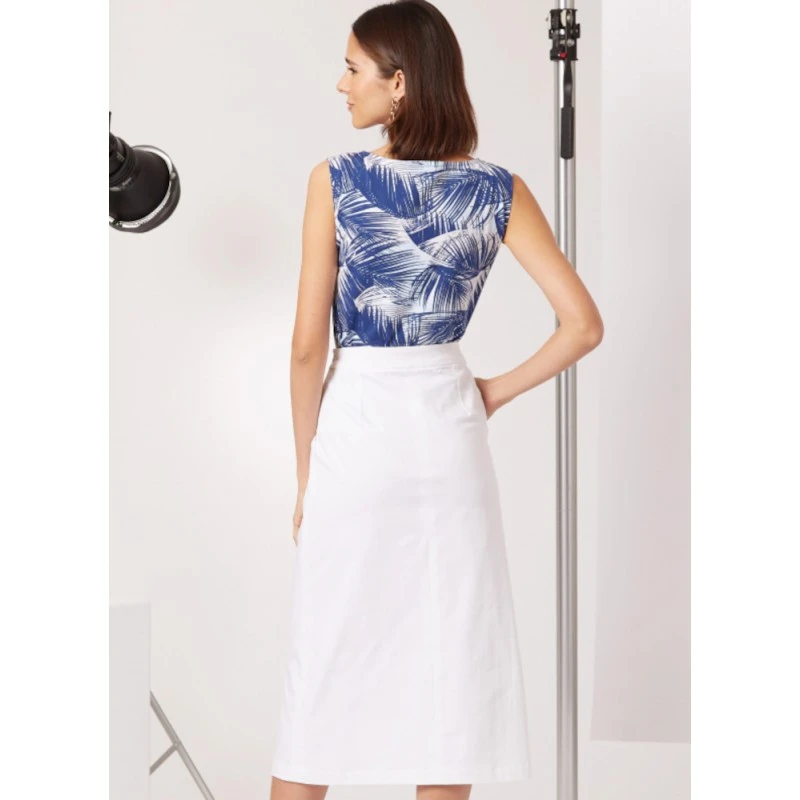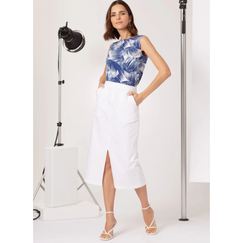 Easy-to-sew sleeveless knit top with bias tape finish. Midi length skirt with side front pockets, side invisible zipper and front slit. Sew Rating: Easy.