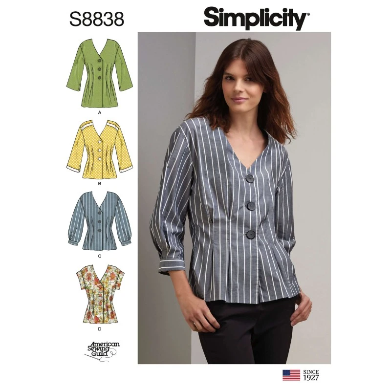 Look effortless chic in these great misses/miss petite shirts. Shirts feature a V-neck collar with button front closer and pleats at the waist. American Sewing Guild for Simplicity.