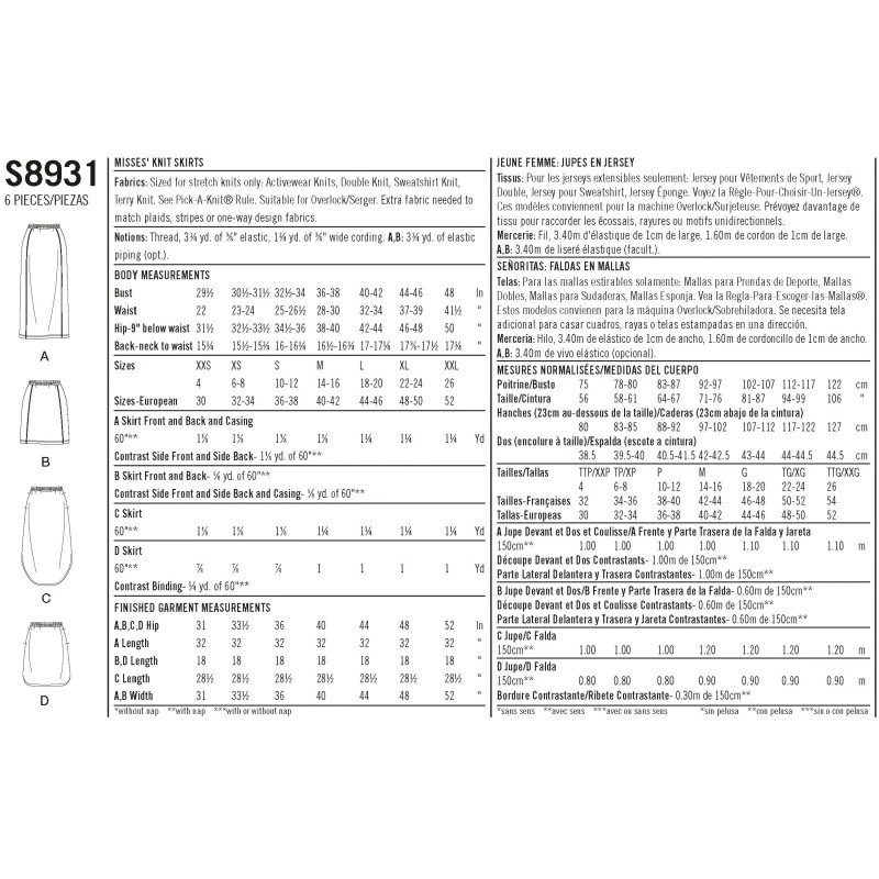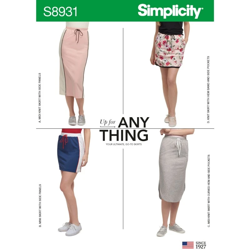 Misses’ athleisure-inspired casual skirts, designed for stretch knits only. Seaming and length variations.