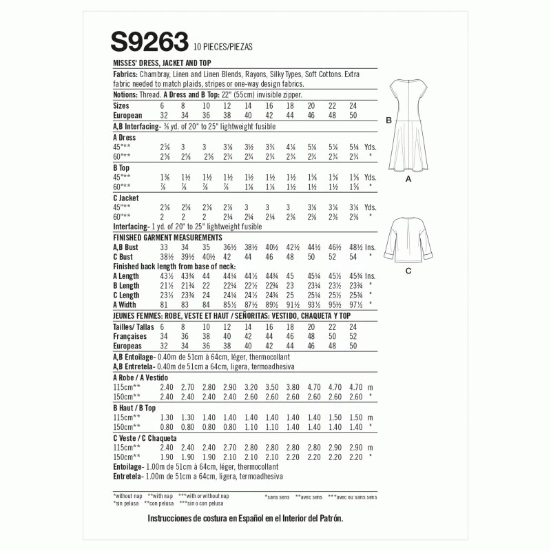Misses’ dress and top with rounded neckline and dropped sleeves. Relaxed, hip length jacket with side-seam pockets.