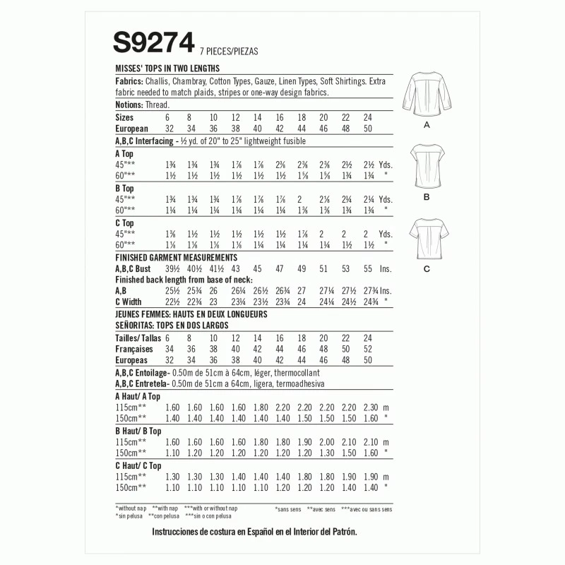 Misses’ tops have round neckline with notched detail and drop shoulders. Sleeve variations and straight or shaped hems.