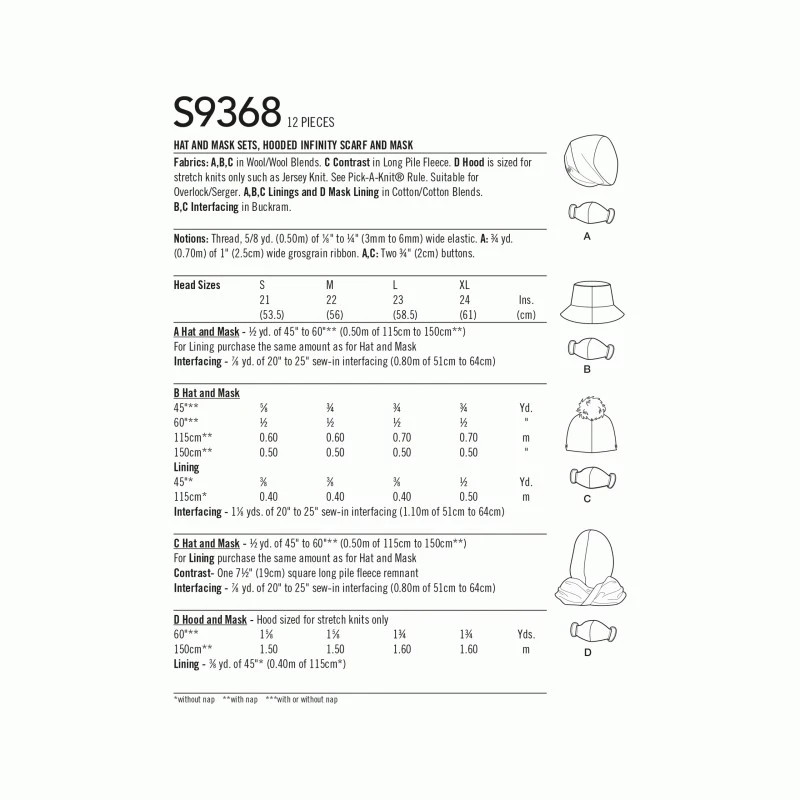 Simplicity Sewing Pattern S9368 Hat Mask Sets Hooded Infinity Scarf