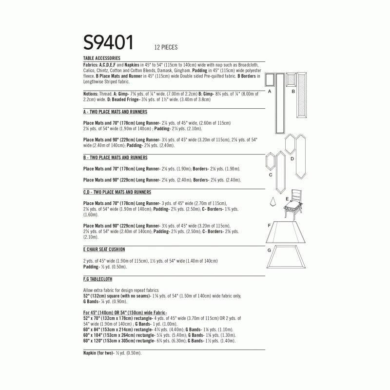 Simplicity Sewing Pattern S9401 Tabletop Accessories and Chair Pad